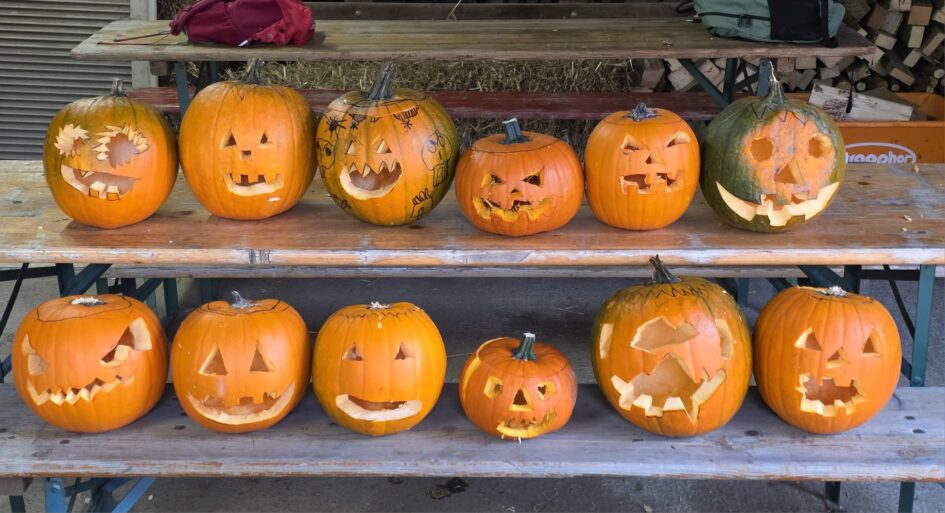 In den letzten Öffnungszeiten haben wir eure Ideen umgesetzt. Wir haben zusammen mit euren Eltern insgesamt 36 Kürbisse geschnitzt! Das war Rekordschnitzen. Und die Kinder haben ganz viele gruselige Kekse gebacken – Fledermäuse, Gespenster und Eulen, aber auch gruselig verzierte Ponys entstanden in der Küche und wurden von allen Kindern schnell aufgegessen. Wir sind gespannt auf eure Ideen, die ihr mit uns zusammen bis zu den nächsten Ferien umsetzen möchtet. Bringt sie mit!